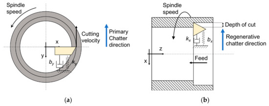 In order to effectively contrast chatter, both frequency and direction of the unstable vibration must be considered. Indeed, the first aspect defines the frequency range of vibrations that must be damped (crucial for sensors and actuators choice), while the second one is related to actuation directions (crucial for actuators optimal placing). Chatter frequency can be estimated by means of chatter prediction models or experimentally measured and it is related to system dynamics. Actuators and sensors resonance frequency should be at least five times greater than chatter frequency in order to guarantee sufficiently low inertia and an effective response time of the active system. The direction along which the chatter arises depends both on chatter type and on boring bar dynamic behavior. In particular, in case of primary chatter, unstable vibrations occur in the cutting velocity direction (Figure 2a), while in case of regenerative chatter, instability is related to vibrations along radial depth of the cut direction (Figure 2b).