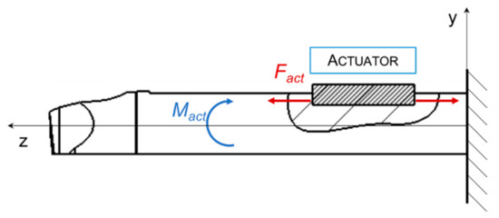 In this section, the chosen actuation strategy is presented and motivated. Different actuation solutions were presented in literature for active boring bars. Chen et al. [16] proposed a solution using magnetic actuators, mounted on a tailored system. Even if this kind of actuators are found to be effective, due to their capability of giving high loads, in the proposed solution the presence of the actuator, mounted on the external surface of the tool, reduces its overhang. In [17], a tool adaptor with an integrated active system is designed and numerically tested. The main drawback of this solution is the required actuation forces, significantly higher compared to other solutions due to inertia, since actuation is applied on a heavy and stiff region (holder). Therefore, in the most common applications [18,19] (Figure 3), actuators are integrated in the tool body and actuation direction is parallel to the tool axis. In this scheme, motion normal to the tool axis is achieved by exploiting the moment (Mact) generated by applying the actuator forces (Fact) with a specific arm respect to the tool axis.