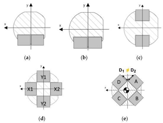 Evaluated solutions of (a) one actuator (b) two parallels actuators, (c) two side actuators, (d) four actuators along x and y direction and (e) selected configuration.