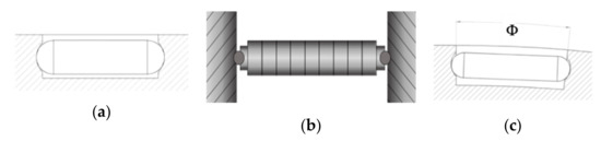 To protect the actuators against lateral forces, spherical end-tips are adopted (Figure 5a). The main advantage of this configuration are: (i) since the joint between actuator and slot can be schematized by a hinge, shear stress are not transferred to the actuators (Figure 5b) (ii) thanks to the spherical shape of the components, the contact between actuators and boring bar is guaranteed even in case of tool deflection (Figure 5c) and (iii) the correct alignment of actuators, after tool deflection, is guaranteed.