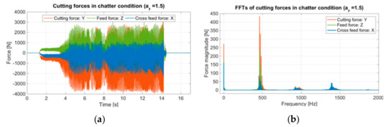 Cutting forces shown in (a) time history and (b) frequency spectrum.