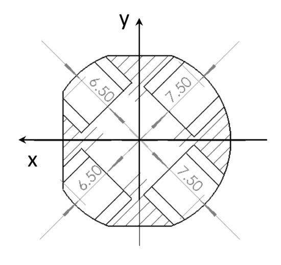 In accordance with the requirements presented in Section 2.1, the integration strategy of the actuators on the boring bar body must guarantee: (i) the actuation in both radial and cutting velocity direction; (ii) maximum effectiveness (i.e., maximize the harm of the forces generated by the actuators; (iii) limited radial size; (iv) dynamic and static equivalence. In the proposed strategy, requirements (i), (ii) and (iii) are achieved by means of a section optimization (presented in this section), while the last requirement is achieved by properly dimensioning protective covers in order to compensate the loss of stiffness due to material removed (Section 2.5).