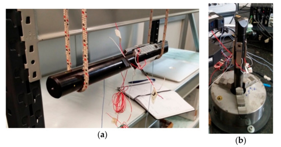 At first, experimental tests were carried out in order to compare the standard boring bar with the realized active boring bar when the control is off. The aim of this validation is to verify that the designed active boring bar presents an equivalent static and dynamic behavior of the standard one (requirement 3 in Section 2.1). Experimental modal analysis was carried out on both boring bars in free-free (Figure 18a) and constrained (fixed-free) conditions (Figure 18b).