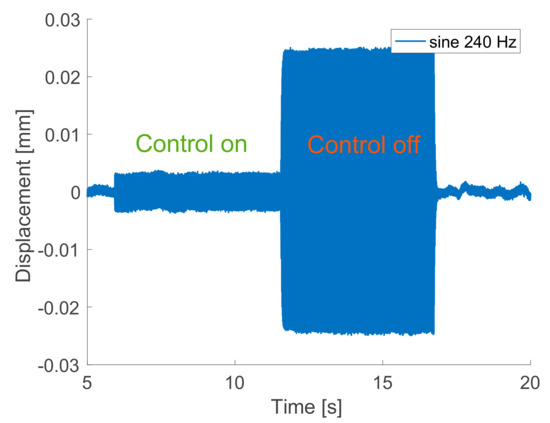 Measured displacement in case of control on and off in case of single frequency force applied.