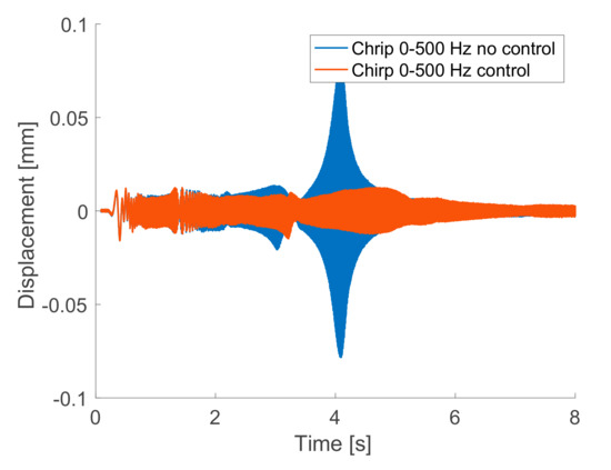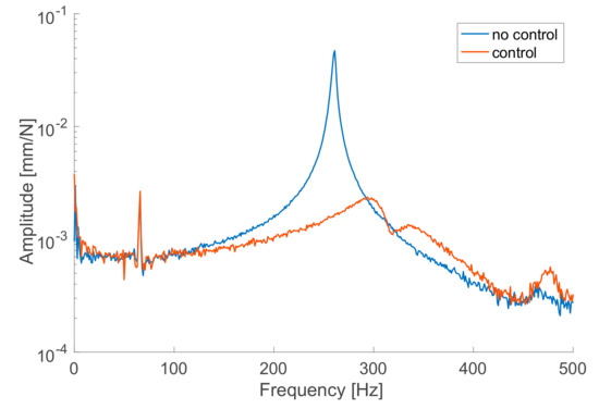 Then, the system was tested by exciting the active boring bar with a multifrequency force (chirp sine between 0–500 Hz). Results in case of control off and on (Figure 21) highlight the effectiveness of the active system in adding damping to the system: vibrations in the frequency range close to the natural frequencies are significantly reduced. Outside, these frequency ranges in the control do not affect the vibrations level, as expected, and no distortions were found.