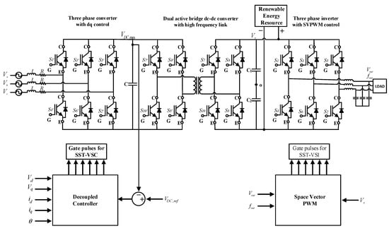 Vector current control was used at the point of common coupling, which regulates the DC voltage control at VSC and power flow control with ac voltage regulation []. In this technique, ac voltage and current of the VSC were converted into a rotating d–q reference frame, which was synchronized with ac grid voltages using a phase locked loop (PLL). This methodology not only regulated DC and ac voltage but also provided the decoupled control of both active and reactive power. The layout of the d–q control architecture-based SST-VSC is shown in Figure 2. The outer control loop produced reference currents for the inner current loop, which then provided the reference voltage for the d–q reference frame.