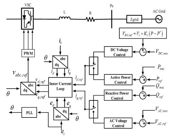 Here represents the angular frequency at the PCC of ac system. Based on (2) and (3), the ICC control layout is shown in Figure 3. The reference signals and were transformed back to the abc frame, which were used to generate switching pulses for IGBTs of VSC.