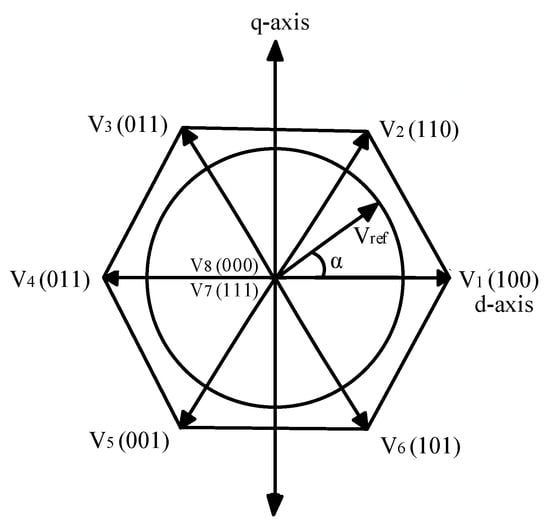 Three phase two level voltage source inverters (VSIs), consisting of two power electronic switches in each leg, have penetrated in the industry as they provide various speed control demands of induction motor drives. A two level VSI has six active states and two null states. Various PWM techniques are proposed in [,] to reduce the VSI output waveform distortions at a given switching frequency. The most popular one is the space vector PWM as it provides low output current ripple and provides maximum utilization of the DC -link voltages [,]. It provides 15% higher ac voltage, lower current and voltage harmonics distortions as compared to conventional PWM []. This is the reason that SVPWM as a modulation technique is employed in this research. The active states divide the space vector plane into six sectors of equal magnitude as shown in Figure 4. Switching states for all eight (six active and two null) vectors are shown in Table 2.