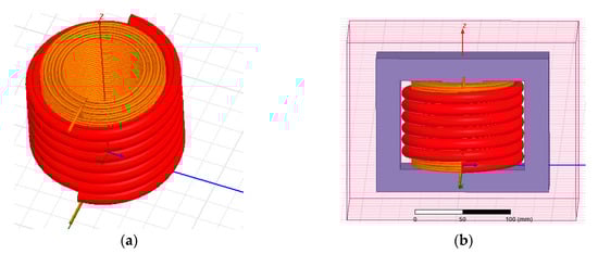 High frequency ferrite core transformer. (a) Primary and secondary coil. (b) Complete transformer model placed within an air medium.