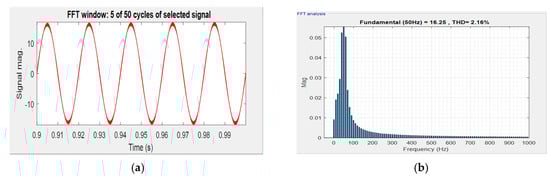 (a) Phase A current drawn from utility. (b) Total harmonic distortion (THD) analysis of phase A current.