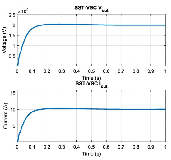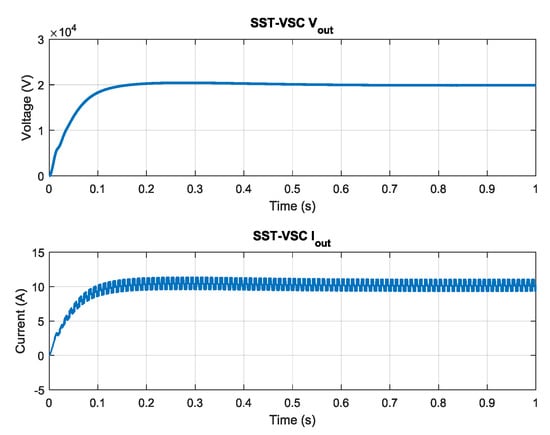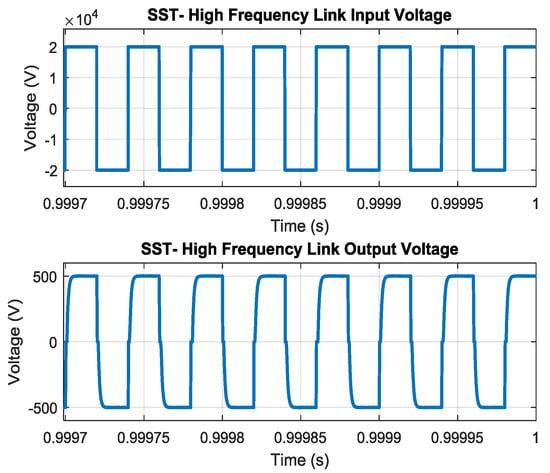 In the dual active bridge (DAB) circuit, the full bridge square wave inverter cascaded at SST-VSC generated a square wave voltage of 25 kHz for the high frequency transformer (HFT), which reduced the voltage level. The other full bridge square wave converter used within DAB, rectified the voltage at the secondary side of HFT. The voltage and current response of the SST-VSC at the DC -link side is given in Figure 11. Voltage at the primary and secondary side of HFT are shown in Figure 12.