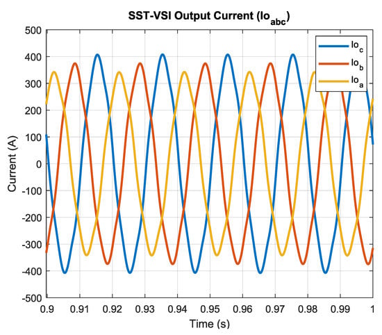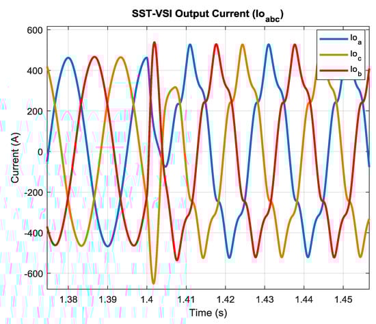 The same was true for the case of a 1.0 p.u. three-phase unbalanced load. Figure 14 and Figure 15 display that SST delivers unbalanced current to the unbalanced load while keeping the SST input voltage (phase A) and current (phase A) in-phase at the grid side, thus ensuring power at the unity power factor.