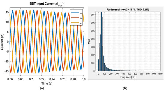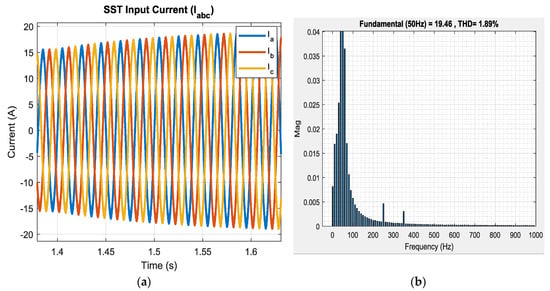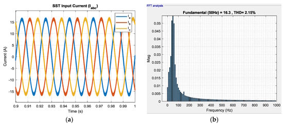 (a) SST input current at the grid side. (b) THD analysis of phase A input current.