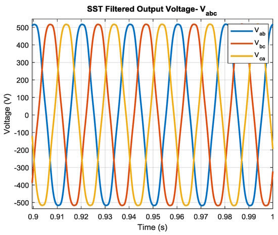 For the case when SST generated the voltage signal of 50 Hz for the inductive load, it could be observed from Figure 19 that the SST input current and the voltage were in phase, thus ensuring the unity power factor. For this case, filtered SST output voltage is shown in Figure 20.