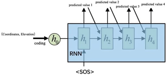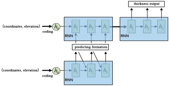 The model in geostratigraphic series prediction uses the RNN as the core of the neural network. The structure is shown in Figure 2. In the machine learning tasks, the input data are coordinated in a stratum, while the output result is the simulation result of the stratum type model corresponding to the given coordinates. Since the RNN does not have a state hidden from the previous moment at the current moment, it is necessary to assign the initial state of the hidden layer neurons in the RNN before each training run. The input coordinates are the common attributes of all the strata in a geostratigraphic series, and it guides the whole process of RNN simulation of the geostratigraphic series. Therefore, the assignment process establishes the correlation between the input coordinates and RNN, guiding the geostratigraphic series simulation from the beginning. The content of the assignment is determined by the input information. After the input layer receives the coordinates of the borehole and the basic elevation information, the coordinate input information is increased from the original three dimensions to the number of dimensions equal to the number of neurons. It serves as the initial state of the hidden layer neurons in the RNN.