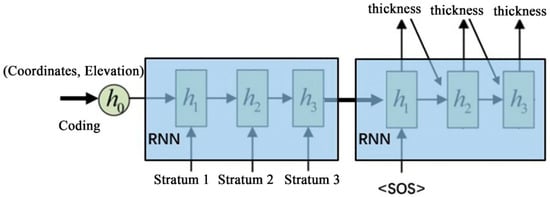 When a recurrent neural network (RNN) is used to process sequential problems, input data are received at every moment, and output is produced after the hidden layer has finished processing the data. Therefore, the input and output of an RNN are equal in length, and it is difficult to process input data of different lengths at the same time. In drilling data, the number of layers in each borehole varies, and the geostratigraphic series is nonuniform. Therefore, the use of an RNN for batch training using stratum data requires filling at the tail of the geostratigraphic series without changing the original sequence of the geostratigraphic series and extending all geostratigraphic series to the same length [37]. Before training, in addition to adding a start of sequence (SOS) to the geostratigraphic series, an end of sequence (EOS) must be added to the geostratigraphic series. For each training set, the sampling process stops when the termination marker appears in the equal length geostratigraphic series output of the RNN. As two virtual stratum types, the initiation and termination markers participate in the RNN training process via the input and output. The initiation markers represent the beginning of geostratigraphic series prediction, while the termination markers represent the end of the series prediction. The introduction of termination markers teaches the RNN model to predict when a sequence will end and overcomes the shortcomings of processing unequally long sequences by the RNN. In addition, the RNN model can conduct geostratigraphic series simulations with different numbers of layers at any location in the research area.
