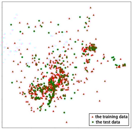 Figure 8 shows the location distributions of the training data and test data in the study area after the original drilling data are segmented into training data and test data, where the red symbols represent the training data, and the green symbols represent the test data. The positions, plotting scale, and geographic coordinates in Figure 8 are the same as in Figure 7.