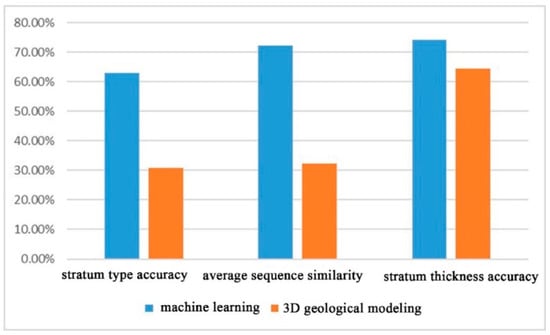 Comparing Table 9 and Table 11, the prediction results histogram of machine learning and 3D geological modeling is obtained in terms of the stratum type, average series similarity, and stratum thickness accuracy, as shown in Figure 42.