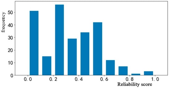 The test borehole provides the real stratum data, and its evaluation result should be higher than that of the 3D model. Moreover, if the stratum distribution of a point in the 3D model is similar to the real situation, the scoring result will be similar to the result of the real stratum. To test the feasibility of the evaluation algorithm based on the 3D geological model, this study uses the algorithm to calculate the reliability score of the test borehole data and the 3D geological model. The calculation and statistical results show that the average reliability score of the test borehole data is 0.6293, which is higher than that of the 3D geological model, as shown in Table 12. In addition, the reliability scores of the test boreholes are mostly higher than 0.5, while those of the 3D geological model are mainly below 0.5, as shown in the Figure 43 and Figure 44.