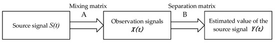 The SOBI method is a relatively robust BSS algorithm that can be used to decompose mixtures of signals into a set of components or putative recovered sources [29]. To better understand the improved SOBI method, the principle of BSS is introduced first. Figure 1 shows an instantaneous linear BSS system model. represents statistically independent unknown source signals. denotes observation signals. Then, let , where denotes a mixing matrix of dimensions [29,30]. The essence of BSS is to find a separation matrix , so that is an optimal estimate of the source signal, which is obtained from the original observation signal through the separation matrix .