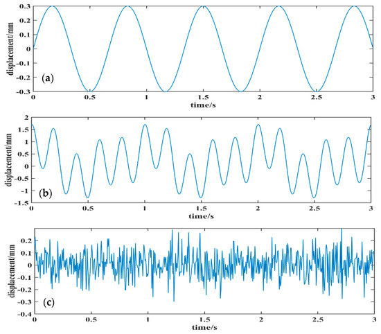 As shown in Figure 4, the three mixed signals were linearly mixed using three sets of simulation source signals. Each mixed signal contained the characteristic information of the three sets of source signals. Without more prior information, the characteristic information of the source signals could not be obtained intuitively from the mixed signals. Using the improved SOBI method, three sets of signals were separated from the three mixed signals.