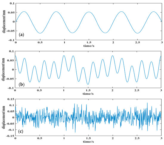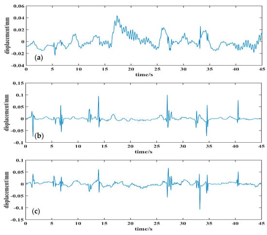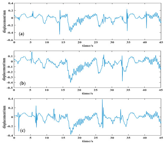 Figure 7a shows the obtained time-series displacement (X1, as shown in Figure 6a) of a mid-span point on the Fengbei Bridge. Due to the influences of the surrounding environment and the equipment itself, there was an inevitable increase in the noise information of the obtained time-series displacement. Therefore, to improve the accuracy of the obtained time-series displacement of the mid-span point on the Fengbei Bridge, using a similar noise as the time-series displacements from the mid-span point, two adjacent monitored points before and after the mid-span point were selected as another two observed signal point (X2 and X3, as shown in Figure 6a). This was done to develop signal de-noising for the mid-span point of the Fengbei Bridge using the improved SOBI method. The time-series displacements of the two adjacent monitored points are shown in Figure 7b,c. Obviously, there are some fluctuations in the curves of the obtained three time-series displacements. These were caused by the transient load of vehicles.