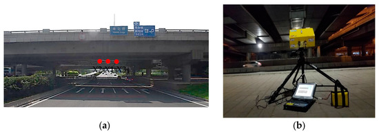 The Fengbei Bridge and the IBIS-S instrument layout. (a) The Fengbei Bridge and (b) the dynamic deflection measurement of the Fengbei bridge using IBIS-S.