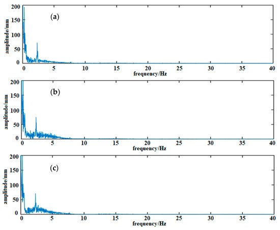 Three separate signal components were obtained using the improved SOBI signal de-noising method, namely S1, S2, and S3, as shown in Figure 8. The inspection of curves of the separated signal components shown in this figure clearly highlight that: (1) as shown in Figure 8a, the separated signal, S1, with an inverted displacement is consistent with the original time-series displacement, X1, of the mid-span point of the Fengbei Bridge, which can be regarded as actual monitored data, and; (2) as shown in Figure 8b,c, there are some sudden changes in these two curves of the separate S2 and S3 signals, which can be regarded as noise signals. These may have been caused by the passing vehicles near the IBIS-S instrument, which led to several vibrations of the IBIS-S instrument. Moreover, there are some smaller fluctuations in these two curves, which may have been caused by the surrounding environment, such as wind thrusts and ground motions. Moreover, as shown in Figure 9, the spectra of the three observed signals are basically the same, with a similar first order frequency of 2.46 Hz. In the spectrum of the separated signal, S1, found using the improved SOBI method, the first order frequency is the same as that of the three observed signals as shown in Figure 10a. This indicates that the separated signal, S1, is the useful signal. However, for the spectra of the separated signals—S2 and S3—found using the improved SOBI method, the frequencies are disorderly and irregular as shown in Figure 10b,c. This indicates that the separated signals—S2 and S3—are noise signals.