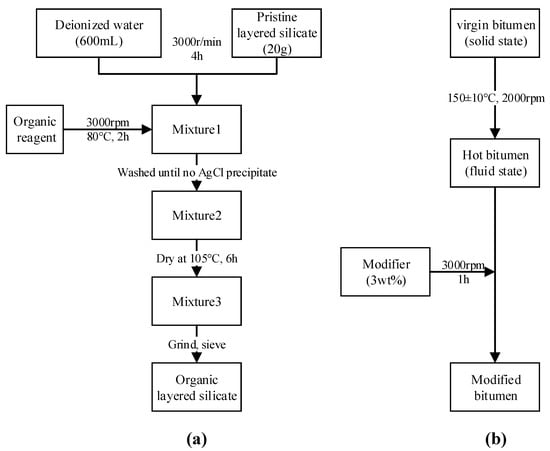 The preparation process of samples: (a) Organic layered silicates; (b) modified bitumens.