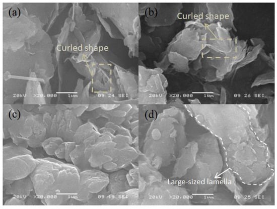 Figure 2 presents the SEM image that demonstrates the morphology of the untreated and treated layered silicates, where the layered structure between them can be compared. For MMT and REC, their platelet edges were generally curled, and the layered structures were unclear in Figure 2a,b, chiefly because of the irregular edges. After organic modification, layered structures were clearly observed; meanwhile, platelet edges were found to be regular without any remarkable curls. This demonstrates that the organic reagent embellishes irregular edges. More precisely, organic reagent molecules are able to form tight ion pairs with the layered silicates by adsorbing negative charges that exist on the surface, as well as to enter interlayers of the layered silicates through the reaction with exchangeable cations [17,21]. By comparing Figure 2c,d, it can be obtained that OREC had a larger-sized platelet than OMMT. Furthermore, both OMMT and OREC exhibited an intercalated structure without an exfoliated platelet, which can be further validated by the XRD test.