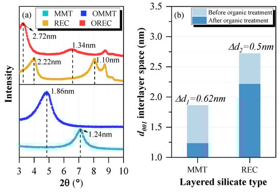 The XRD test result for the untreated and treated layered silicates is shown in Figure 3. It can be seen that in Figure 3a, the layered silicates all had the intercalated structure with different d001 interlayer spaces, where REC had a remarkably larger d001 interlayer space as compared to MMT, irrespective of the organic treatment. This is ascribed to the nature of the pristine layered silicate. Moreover, Figure 3a also shows that the d002 interlayer space of REC was 1.10 nm, which increased to 1.34 nm after the organic treatment. From Figure 3b, MMT had a greater increment in d001 value than REC, which can be attributed to the nature of the layered silicates. As mentioned in the Introduction, MMT has a larger cation exchange capacity than REC. As a result, more organic reagent molecules can insert MMT interlayers through the cation exchange reaction, and correspondingly, the interlayer space of MMT is largely increased.