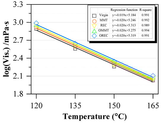 Aiming at investigating the effect of the layered silicate type on the flowability and high-temperature properties of virgin bitumen, the viscosity of all bitumen specimens at four high temperatures (120 °C, 135 °C, 150 °C, and 165 °C) is provided (Figure 4). As expected, viscosity increased with the incorporation of the modifiers, which can be attributed to the restriction of the modifiers on the motion of the bitumen molecules [29,33,36]. With respect to the modifier type, regardless of the test temperature, OREC endowed the virgin bitumen with the largest viscosity, contrary to MMT, and there was a similar viscosity for the REC-modified bitumen and the OMMT-modified bitumen, which is probably related to the specific surface area of the layered silicates in the bitumen matrix [17,36]. In detail, OREC is characterized by the largest interlayer space (obtained from Figure 4) and aspect ratio amongst these four silicates. Therefore, OREC has the largest specific surface area to hinder the motion of the bitumen molecules (or the flowability of bitumen) most effectively. However, although organophilic OMMT has a smaller aspect ratio and interlayer space than hydrophilic REC, it has a better compatibility with bitumen due to the organic treatment, which helps to enhance the specific surface area of OMMT particles in the bitumen matrix [17,18]. Additionally, it can also be noted that, in Figure 4, the temperature dependency of the viscosity was obvious, as the viscosity reduced nearly linearly with the temperature. The viscosity at other temperatures can be predicted based on the linear regression functions listed in this figure.