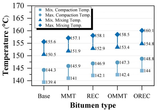 To ensure uniform mixing and effective compaction of the bitumen mixture, as well as to prevent the aging caused by too high temperatures, the bitumen pavement construction needs to control the construction temperature (including the mixing and compaction temperatures) of the bitumen mixture within an appropriate range. According to the Superpave specification [38], the mixing and compaction temperatures of these bitumens are obtained, as displayed in Figure 5. It can be seen that the modification promoted an increase in the mixing and compaction temperatures. Among these layered silicates, OREC endowed bitumen with the highest mixing temperature, followed by OMMT, REC, and MMT. Similar trends could be found for compaction temperature results. Significantly, the results in Figure 5 provide guidance for practical construction.