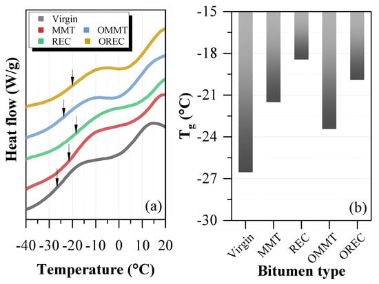 Cao et al. [39] and Zhang et al. [40] reported that there is a tight link between the glass transition temperature (Tg) gained by the differential scanning calorimetry (DSC) test and the low-temperature property for bitumen. That is to say, the lower Tg causes the greater fracture energy, which reflects better low-temperature cracking resistance. On the whole, the Tg is gained from the inflection point of the curve corresponding to the first scan, as seen in Figure 10a [40,41]. Figure 10b compares the Tg value amongst these bitumens. It is observed that in Figure 10b, the existence of layered silicates caused an increase in Tg, which indicates a negative effect of the layered silicates on the low-temperature cracking resistance of bitumen. Moreover, the comparison of these modified bitumens shows that MMT endowed virgin bitumen with a higher Tg than REC, regardless of the organic modification. Therefore, it can be concluded that, although the layered silicate has an adverse effect on the low-temperature cracking resistance of bitumen, MMT exhibits a relatively small impact as compared to REC, which is consistent with the discussion of the BBR results.