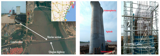 With the development of modern society and technology, more and more huge reinforced concrete (RC) structures have been built in China [1,2,3], such as Hong Kong-Zhuhai-Macau (HZM) bridge (49.968 km long, in service), Hangzhou Bay bridge (36 km long, in service) and Jiaozhou Bay bridge (36.48 km long, in service). As reinforced concrete sea-crossing bridges service in marine environments, chloride ions penetrate the concrete cover and result in the corrosion of the reinforced bars, thereby causing serious damage to the bridge structures [4,5,6,7,8]. Many problems caused by the corrosion of reinforced bars have been reported all over the world. Further, corrosion-associated maintenance and repair of reinforced concrete (RC) structures have cost multiple billions of USD per annum [9]. In some developed countries, nearly 3.5% of their gross national product (GNP) has been applied in the repair cost [10]. In order to reduce the repair cost, the durability design of RC structures, in particular, those exposed to marine environments, has been recognized as an effective means to ensure the service life of concrete structures, which has been a focus of researchers and engineers all over the world [11,12,13].