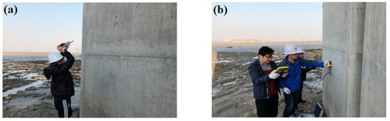 Rebound strength and cover thickness tests at piers. (a) Rebound strength; (b) Cover thickness.