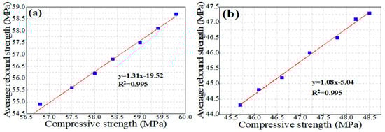 Linear relationships between compressive strength and average rebound strength for concrete in the marine and land sections. (a) Marine section; (b) Land section.