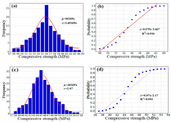 After curing in situ, the compressive strength and rebound strength of the casting concrete specimens (100 mm × 100 mm × 100 mm) used in the marine and land sections were measured by a compression-testing machine and rebound hammer, respectively. As shown in Figure 4, the linear relationships between the compressive strength and the average rebound strength of the concrete specimens were obtained. In order to evaluate the actual compression strength of the large volume of pier concrete (exceeding 300 m3), the rebound strengths of the pier concrete in the marine and land sections were measured by a rebound hammer, and then the compressive strengths were calculated using the regressed linear relationships (Figure 4) based on the measured rebound strengths, which are shown in Figure 5. The compressive strengths of the concrete in the marine and land sections also follow a normal distribution. Further, the mean compressive strengths of concrete in the marine and land sections are 56 MPa and 46 MPa, respectively. The corresponding standard deviations are 2.45 MPa and 2.67 MPa, respectively. The designed compressive strengths of the concrete in the marine and land sections are 50 MPa and 40 MPa, respectively. Hence, the actual mean compressive strength of the concrete is higher than the designed strength. However, the minimum measured compressive strength is less than the designed strength, by about 7.2%.