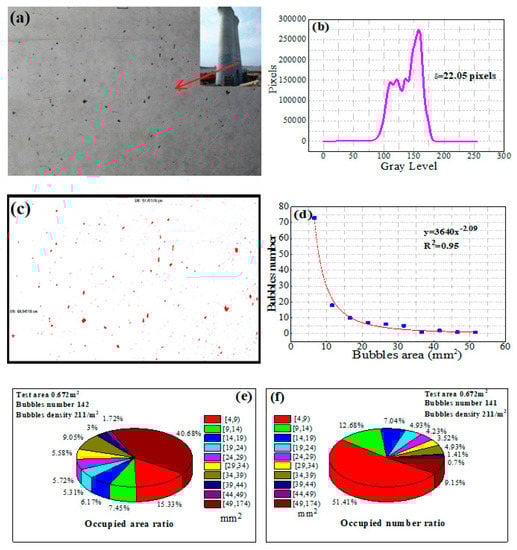 Concrete surface defects. (a) Concrete surface; (b) Gray level processing; (c) Bubble area calculation; (d) Relationship between bubble area and bubble number; (e) Percentage of bubbles area occupied; (f) Percentage of bubble number occupied.