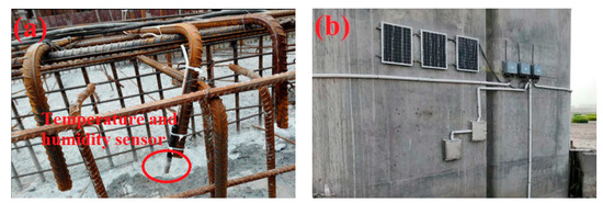 The temperature and relative humidity (RH) in concrete affects the chloride ions’ transportation, and large changes in temperature and RH can even cause the concrete to crack. High temperature will increase the migration capacity of chloride ions in concrete, considering the time-varying performance of temperature response, and thus the transport of chloride ions in concrete will be affected by temperature. Moreover, the internal temperature of concrete is greatly influenced by the service environment [33]. Temperature and humidity sensors were pre-embedded inside the concrete at a depth of 25 mm from the concrete surface, and a wireless transportation apparatus was used to collect the monitoring data automatically, as shown in Figure 9.