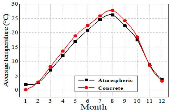 As mentioned above, both the load level and temperature affect the chloride diffusion coefficient of concrete. The loading factor ‘ks’ and temperature factor ‘kt’ were introduced into the model, and they are shown, respectively, in Equations (8) and (9). It is worth noting that the revised DuraCrete model (Equation (8)) was improved from Equation (7), whose chloride diffusion coefficient was multiplied by the loading factor ‘ks’ and temperature factor ‘kt’ in order to enlarge the chloride diffusion coefficient considering the effect of the two parameters. Reference [35] highlighted the temperature factor, which needs to be further considered, and in Equation (9), T is the monthly average temperature monitored by embedded relative temperature and humidity sensors. According to Equation (9), it was concluded that different monthly values contribute to various mean values of temperature factor ‘kt’. As shown in Figure 10, the minimum value of average monthly temperature was 2 °C (275 K) and the maximum was 28 °C (301 K), respectively. Correspondingly, the minimum and maximum values of ‘kt’ were 0.41 and 1.31, respectively. Even if the maximum ‘kt’ value were to be used, resulting in the minimum value of the remaining service life, it would still satisfy the designed service life of 100 years.