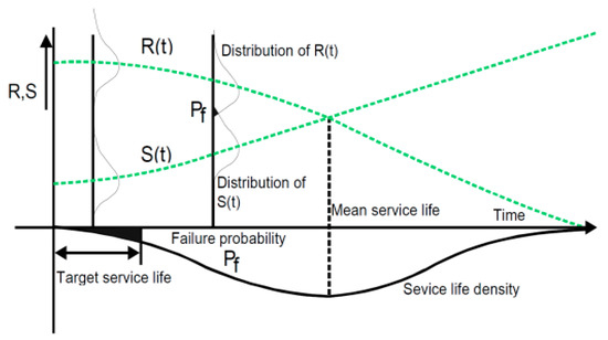 The performance evolution of a concrete structure with respect to reinforced corrosion and related events, from reinforced depassivation to construction collapse, is shown in Figure 11. During the first period, chloride ions penetrate into the concrete and induce the depassivation of the reinforced bar. This period is named the design service life of concrete in marine environments. Since there are fluctuations in the durability parameters of concrete, a reliability design is introduced into the durability design, and the design idea is shown in Figure 12. The probability of failure within the period [0, T] can be expressed by Equation (5), and the limit state function can be written as Equation (6). The service life prediction model of concrete in chloride environments, as suggested by DuraCrete, is shown as Equation (7).