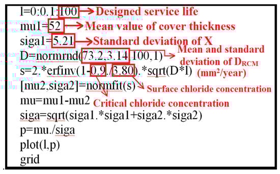 According to Equation (8), the chloride diffusion coefficient and the cover thickness x are the most significant factors that affect the service life of a concrete structure. In order to investigate the target reliability , Monte-Carlo (MC) simulations were carried out using the software Matlab in order to provide further evidence for the durability performance assessment (Figure 13). The acceptance criterion was defined in terms of the reliability index, , as follows: