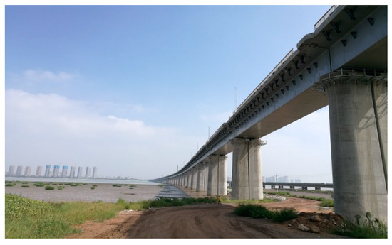 Chloride penetration into concrete is much more severe than carbonation-induced corrosion of reinforced bars in concrete structures in marine environments. Therefore, only chloride-induced corrosion of reinforced bars was considered, and the revised DuraCrete model (Equation (8)) was used to predict the service life of a concrete structure. Since it is difficult to measure the concrete cover thicknesses of the box girder and platform, the designed cover thicknesses and the corresponding standard deviations with assumptions were used in the service life prediction calculations. On the other hand, the measured concrete cover thickness of the pier concrete was used in the service life prediction calculations. Figure 14 shows a photograph of the Jiaozhou Bay sea-crossing railway bridge in its completed state.