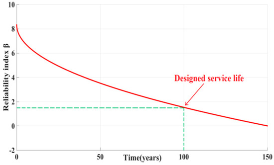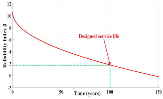 The reinforced concrete in the Jiaozhou Bay sea-crossing railway bridge in the land section was mainly damaged by salt fog, and concrete with a compressive strength grade of C40 and a cover thickness of 35 mm was used. The service environment of the reinforced concrete in the land section can be divided into atmospheric zones, and the mainly durability parameters are listed in Table 12. The apparent chloride diffusion coefficient was 4.38×10−12 m2/s, and the concrete cover thickness was 36 mm with a margin of 3.18 mm. The reliability index of the reinforced concrete located in the land section, in service for 100 years, is 1.71, while the predicted service life is 173.8 years, which meets the designed service life requirement (Figure 18).
