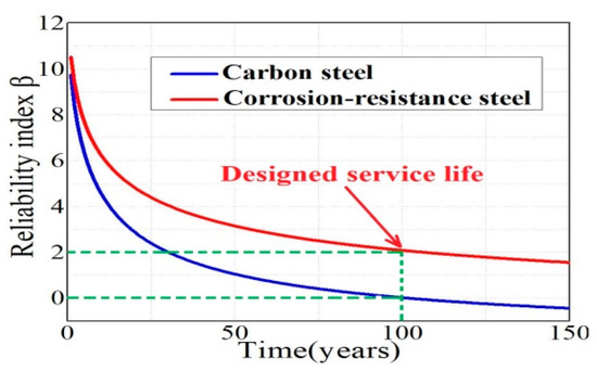 Table 11 shows that the critical chloride concentration for the carbon reinforced bars in the splash zone is 0.9%. On the other hand, as the corrosion-resistant reinforced bars are more corrosion-resistant, the critical chloride concentration for the corrosion-resistant reinforced bars in the splash zone is 4.5% [41,42,43]. For the pier concrete with carbon reinforced bars, the reliability index of the reinforced concrete after 100 years of service is only 0.03. On the other hand, for the pier concrete with corrosion-resistant reinforced bars, the reliability index of the reinforced concrete after 100 years of service is nearly 2.0. The higher reliability index can be attributed to the higher critical chloride concentration in the corrosion-resistant reinforced bars as compared to that in the carbon reinforced bars. Further, the service life of the pier with corrosion-resistant reinforced bars in the marine section is 263.2 years, and its reliability index is 2.01 when serving for 100 years.