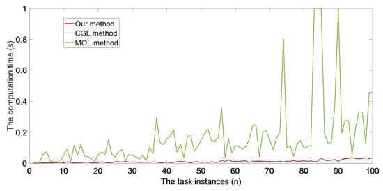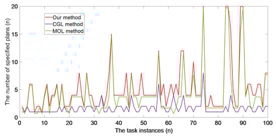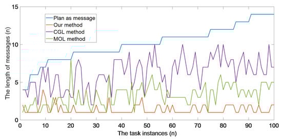 For this environment, there are a total of 8100 tasks (a task is specified by a pair of agents’ states <initial, goal>, ), of which 350 tasks introduce RC. We obtain that the number of language words generated by our approach, CGL, and MOL are 6, 7, and 2, respectively. For the sake of contrast, we conduct 100 RC tasks at random and record the relevant data. Figure 5, Figure 6 and Figure 7 separately show the length of the communicative messages, the number of specified optimal plans, and the time cost of sentence generation, respectively. The red, purple, and green curves represent the results achieved by our method, CGL, and MOL, respectively. In Figure 5, the blue curve denotes the number of states in the plans. As we can see, coordination messages generated by our algorithm are quietly shorter than those of other communication methods, which greatly reduces the burden of communication of agents. Figure 6 shows that our sentences could specify many available plans for agents to follow, which gives them more flexibility to execute tasks. Although the constructed language in this work is not minimal, our approach has nearly comparable benefits to those of MOL in this respect. Furthermore, as can be seen in Figure 7, the computation costs of language planning using our method are much less than the costs of MOL. As with CGL, the complexity of the SGP in our method is almost equivalent to the task planning problem. In general, the results show that our languages offer considerable advantages compared to CGL and MOL in these criteria.