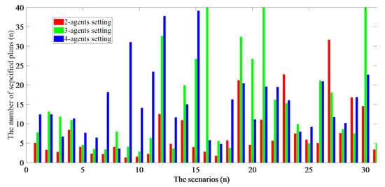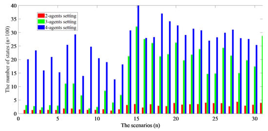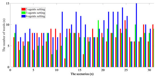 We also implement our algorithm to the path-planning problem in 30 grid-world scenarios. For each scenario, we separately run 500 RC tasks in the setting of two, three, and four agents. Figure 8 and Figure 9 demonstrate the number of agents’ joint states and our language words used in these tasks, respectively. The number of words is far smaller than the states, which means that agents require less effort to understand the messages by our approach. To assess the benefits of the languages in terms of communication cost and behavioral flexibility of agents, we compute their coordination sentences and specified plans for all task plans. Bars in Figure 10 represent the average decrement of the length of sentences compared with plan sequences. The communication costs decline by 60% on average using the languages. Bars in Figure 11 indicate the average amount of plans specified by the sentences. From these results, we can learn that the constructed languages are quite useful for multi-agent coordination.