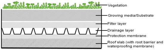 Constructing green roofs combined with rainwater harvesting systems in buildings can boost the advantages of each of these technologies [28,29]; their combination should also be considered a very promising solution to face climate change and increase sustainability in cities [30,31]. When designing a rainwater harvesting system combined with a green roof structure, several factors should be considered, such as the roof runoff coefficient [32].