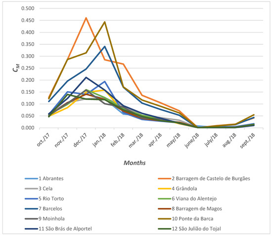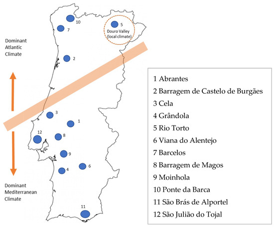 Assuming its validity in Portugal, Formula (1) was applied to 12 weather stations (Figure 3 and Figure 4), where it is possible to obtain temperature and precipitation values, to calculate theoretical values for the monthly runoff coefficients for green roofs with characteristics similar to those of the pilot system [32,33,34,35,36,37,38] and find patterns related to the climatic nuances in the country. For these weather stations, the historical record of monthly rainfall and temperatures is available on the Portuguese government’s SNIRH – Sistema Nacional de Informação de Recursos Hídricos website (https://snirh.apambiente.pt/).